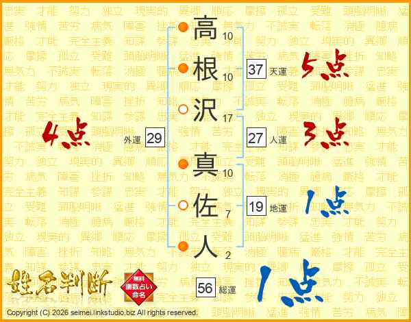 高根沢真佐人さんの天運は37画の5点!