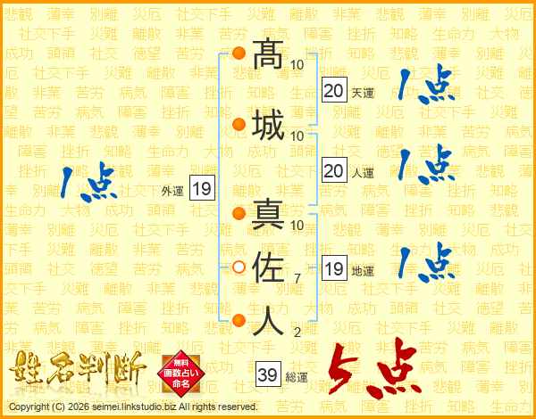 髙(10画)城(10画) 真(10画)佐(7画)人(2画)