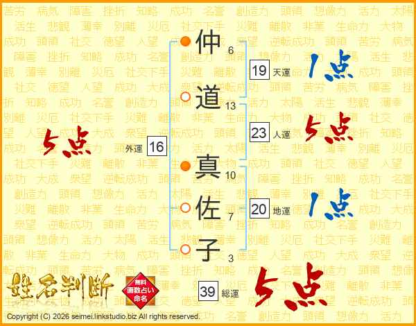 仲(6画)道(13画) 真(10画)佐(7画)子(3画)