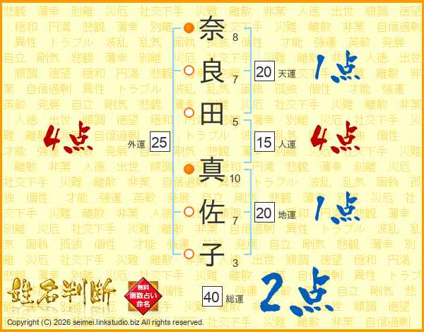 奈(8画)良(7画)田(5画) 真(10画)佐(7画)子(3画)
