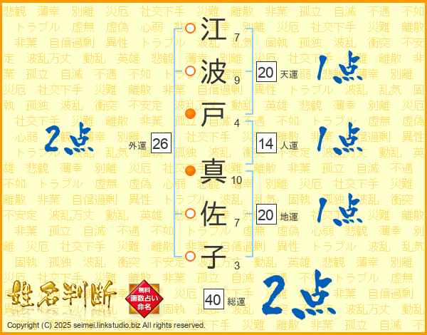 江(7画)波(9画)戸(4画) 真(10画)佐(7画)子(3画)