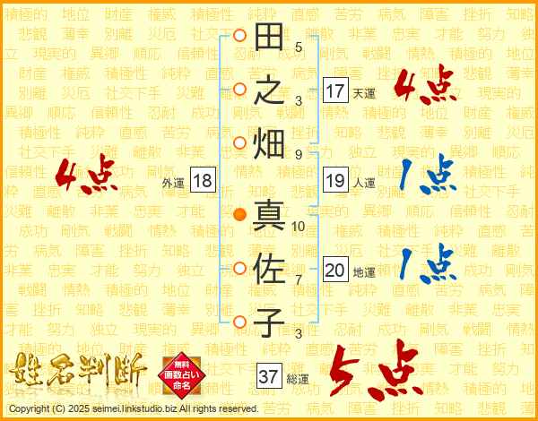 田(5画)之(3画)畑(9画) 真(10画)佐(7画)子(3画)