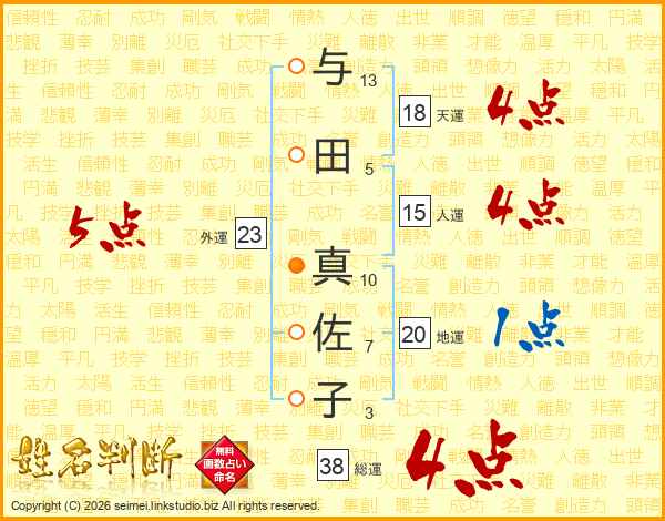 与(13画)田(5画)  真(10画)佐(7画)子(3画)
