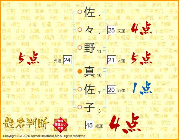 佐々野真佐子さんの総運は45画の4点!