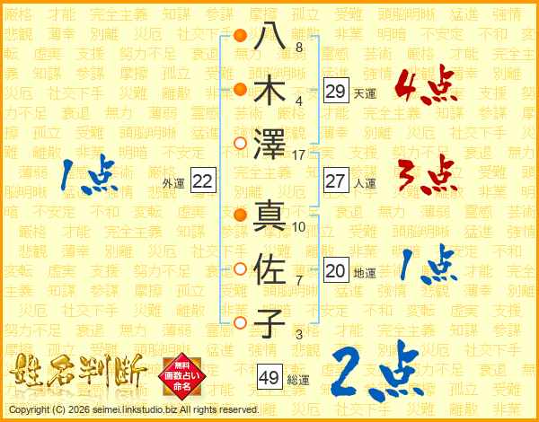 八(8画)木(4画)澤(17画) 真(10画)佐(7画)子(3画)