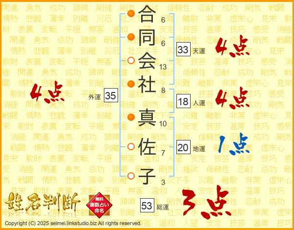 合(6画)同(6画)会(13画)社(8画) 真(10画)佐(7画)子(3画)