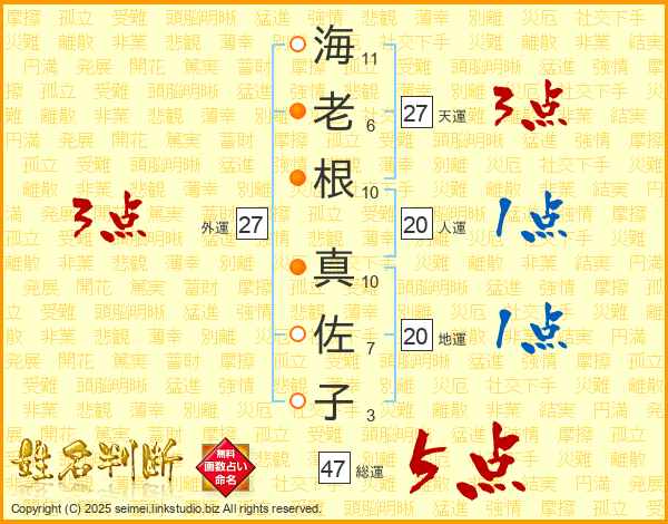 海(11画)老(6画)根(10画) 真(10画)佐(7画)子(3画)