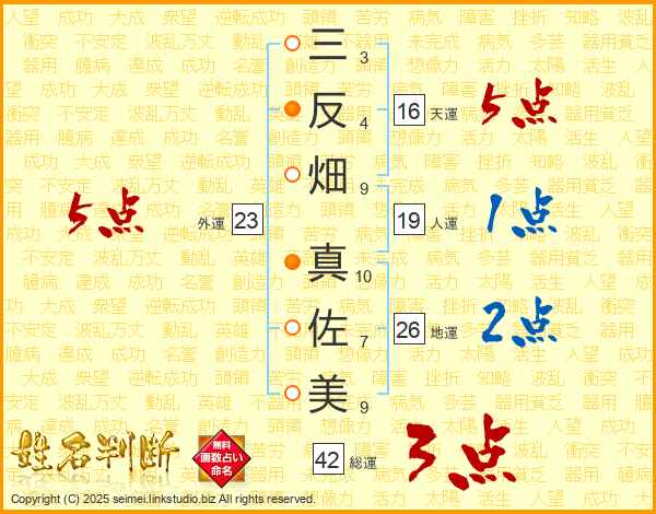 三(3画)反(4画)畑(9画) 真(10画)佐(7画)美(9画)