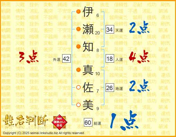 伊(6画)瀬(20画)知(8画) 真(10画)佐(7画)美(9画)