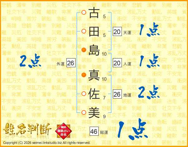 古(5画)田(5画)島(10画) 真(10画)佐(7画)美(9画)