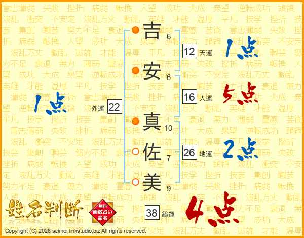 吉(6画)安(6画) 真(10画)佐(7画)美(9画)