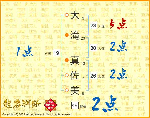 大(3画)滝(20画) 真(10画)佐(7画)美(9画)