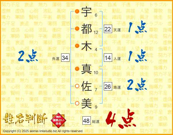 宇(6画)都(12画)木(4画) 真(10画)佐(7画)美(9画)