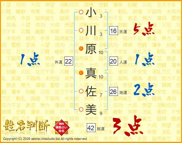 小(3画)川(3画)原(10画) 真(10画)佐(7画)美(9画)