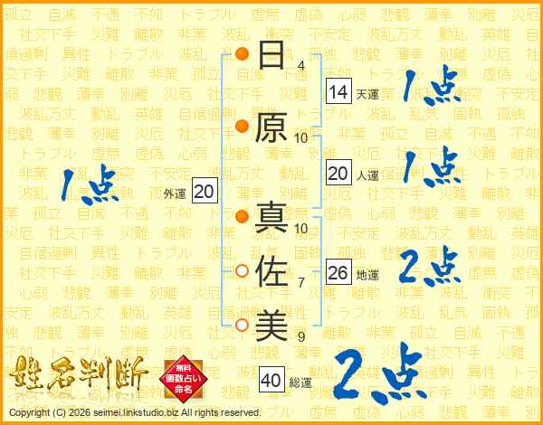 日(4画)原(10画) 真(10画)佐(7画)美(9画)