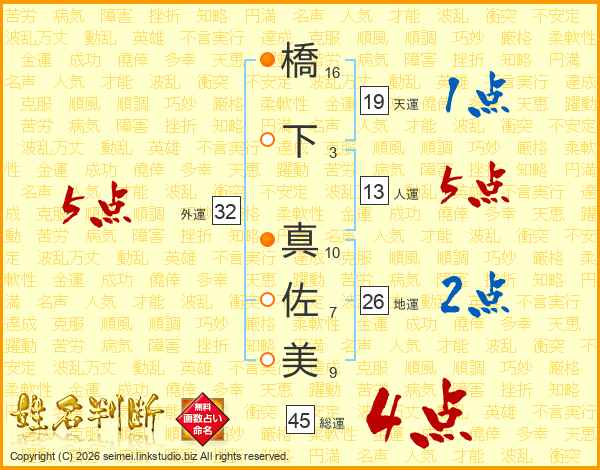 橋(16画)下(3画) 真(10画)佐(7画)美(9画)