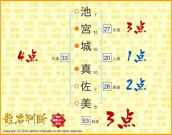 池(7画)宮(10画)城(10画) 真(10画)佐(7画)美(9画)