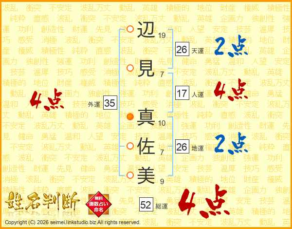 辺(19画)見(7画) 真(10画)佐(7画)美(9画)