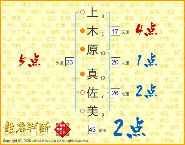 上(3画)木(4画)原(10画) 真(10画)佐(7画)美(9画)