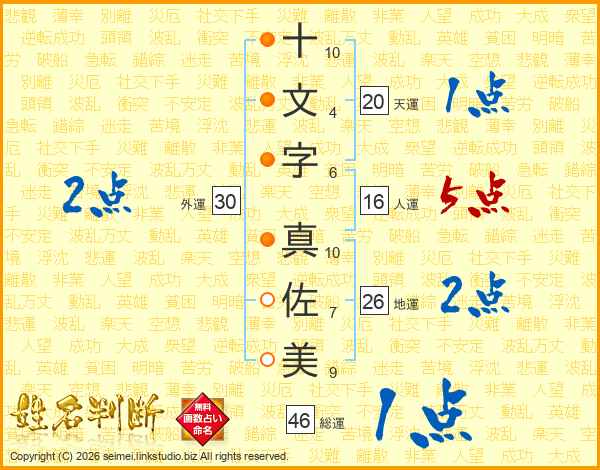 十(10画)文(4画)字(6画) 真(10画)佐(7画)美(9画)