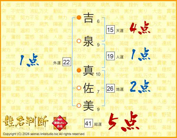 吉(6画)泉(9画) 真(10画)佐(7画)美(9画)