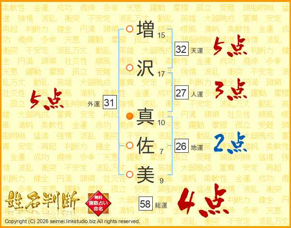 増(15画)沢(17画) 真(10画)佐(7画)美(9画)
