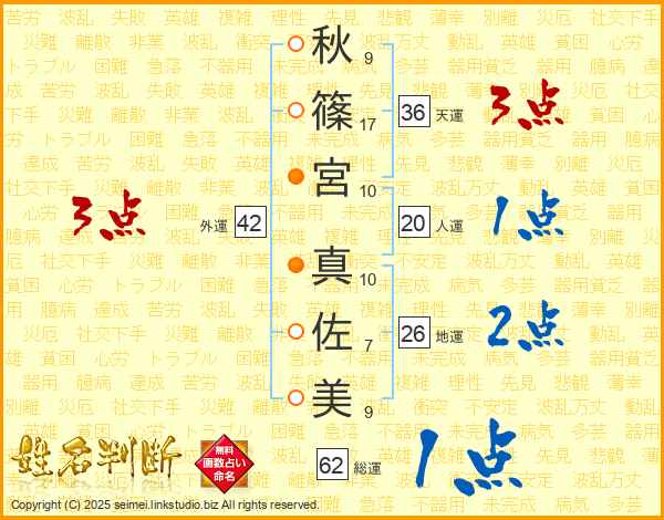 秋(9画)篠(17画)宮(10画) 真(10画)佐(7画)美(9画)