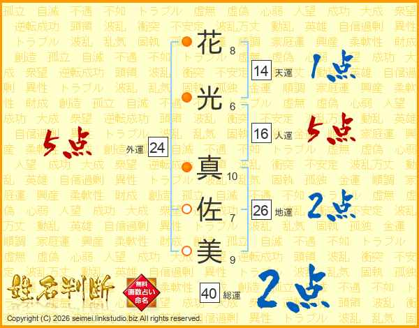 花(8画)光(6画) 真(10画)佐(7画)美(9画)