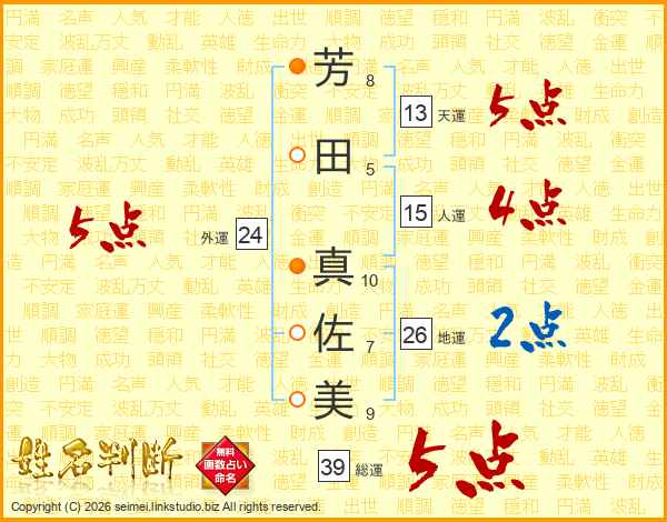芳(8画)田(5画) 真(10画)佐(7画)美(9画)
