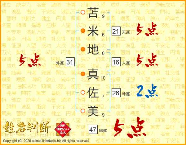 苫(9画)米(6画)地(6画) 真(10画)佐(7画)美(9画)