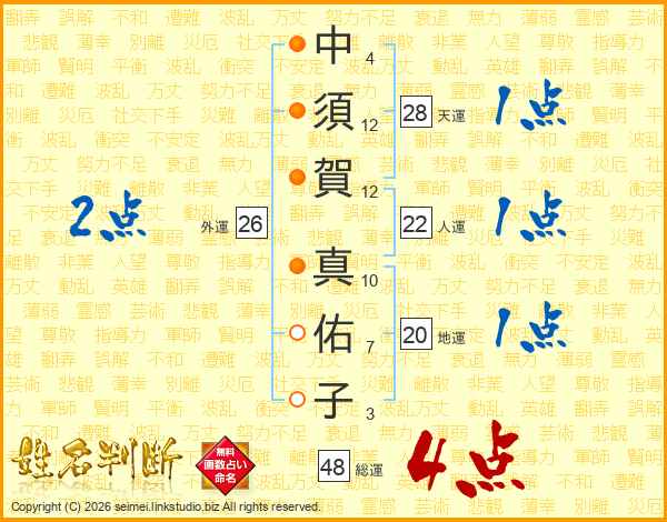 中(4画)須(12画)賀(12画) 真(10画)佑(7画)子(3画)