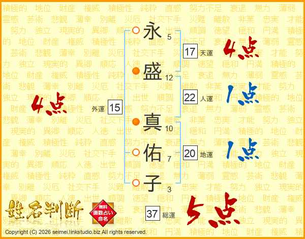 永(5画)盛(12画) 真(10画)佑(7画)子(3画)