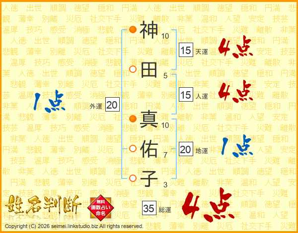 神(10画)田(5画) 真(10画)佑(7画)子(3画)