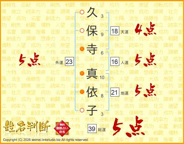 久(3画)保(9画)寺(6画) 真(10画)依(8画)子(3画)