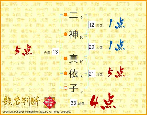 二神真依子さんの総運は33画の4点!