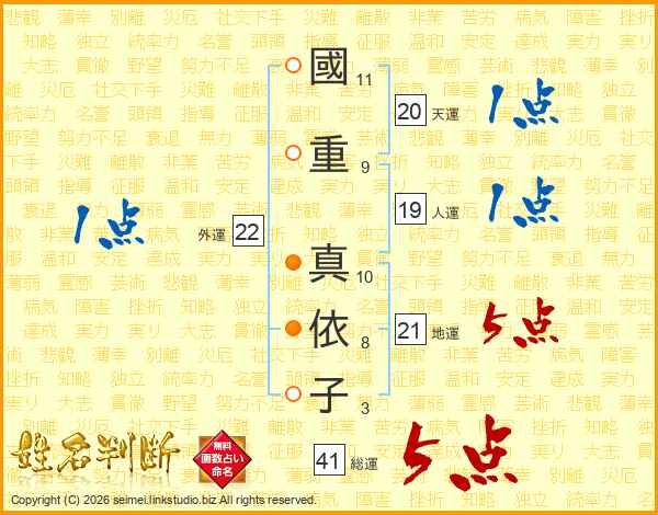 國(11画)重(9画) 真(10画)依(8画)子(3画)