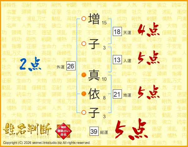 増(15画)子(3画) 真(10画)依(8画)子(3画)