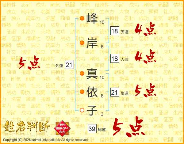 峰(10画)岸(8画) 真(10画)依(8画)子(3画)