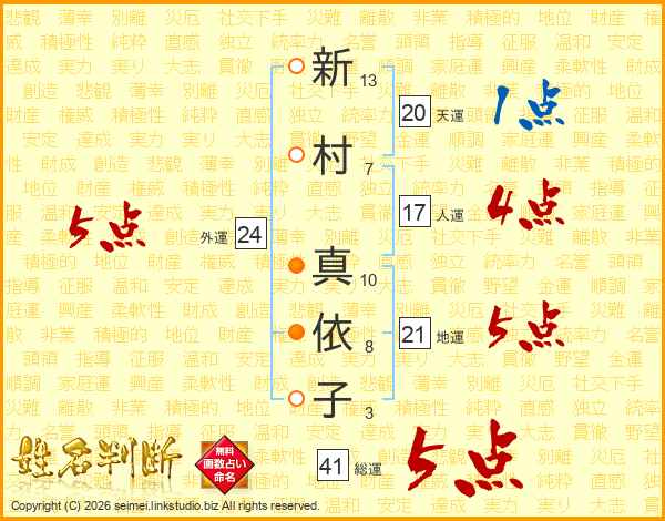 新村真依子さんの総運は41画の5点!
