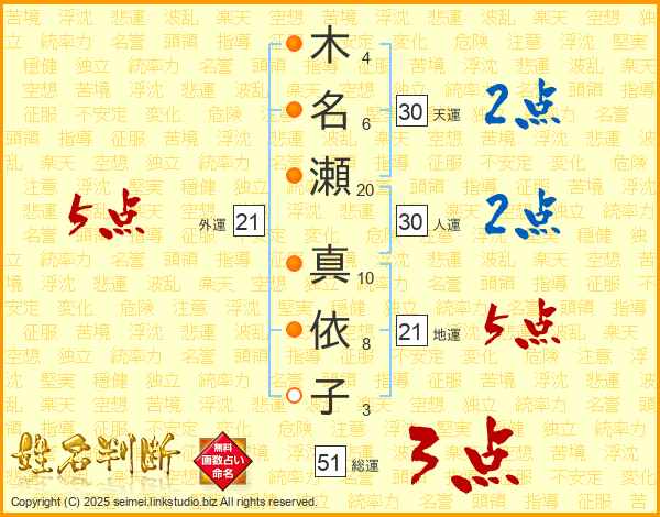 木(4画)名(6画)瀬(20画)  真(10画)依(8画)子(3画)