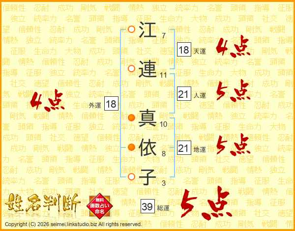 江(7画)連(11画) 真(10画)依(8画)子(3画)
