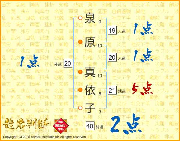 泉(9画)原(10画) 真(10画)依(8画)子(3画)