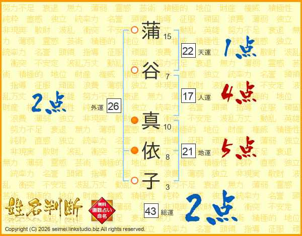 蒲(15画)谷(7画) 真(10画)依(8画)子(3画)