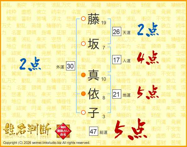 藤(19画)坂(7画) 真(10画)依(8画)子(3画)