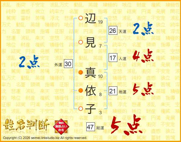 辺(19画)見(7画) 真(10画)依(8画)子(3画)