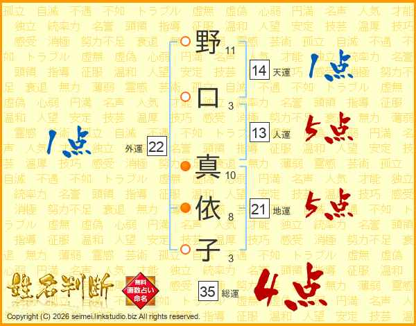 野(11画)口(3画) 真(10画)依(8画)子(3画)