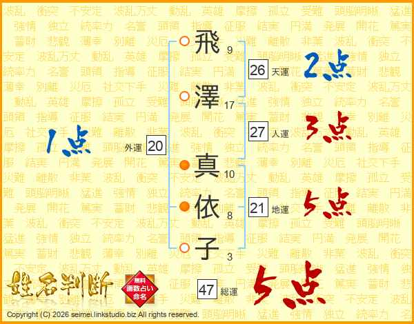 飛(9画)澤(17画) 真(10画)依(8画)子(3画)