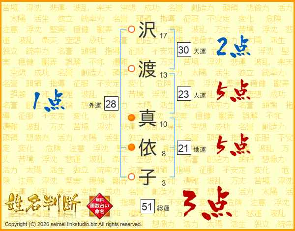 沢(17画)渡(13画) 真(10画)依(8画)子(3画)