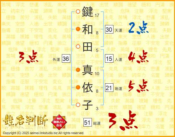 鍵(17画)和(8画)田(5画) 真(10画)依(8画)子(3画)