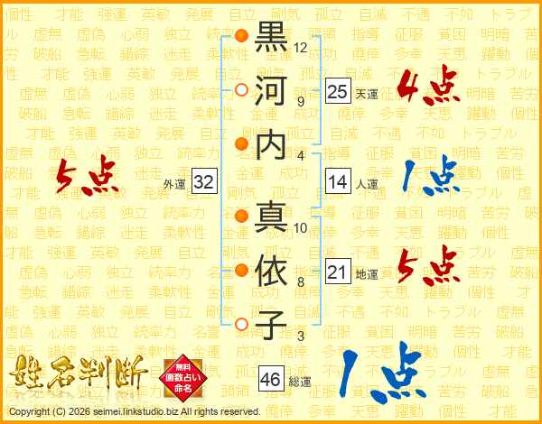 黒(12画)河(9画)内(4画) 真(10画)依(8画)子(3画)